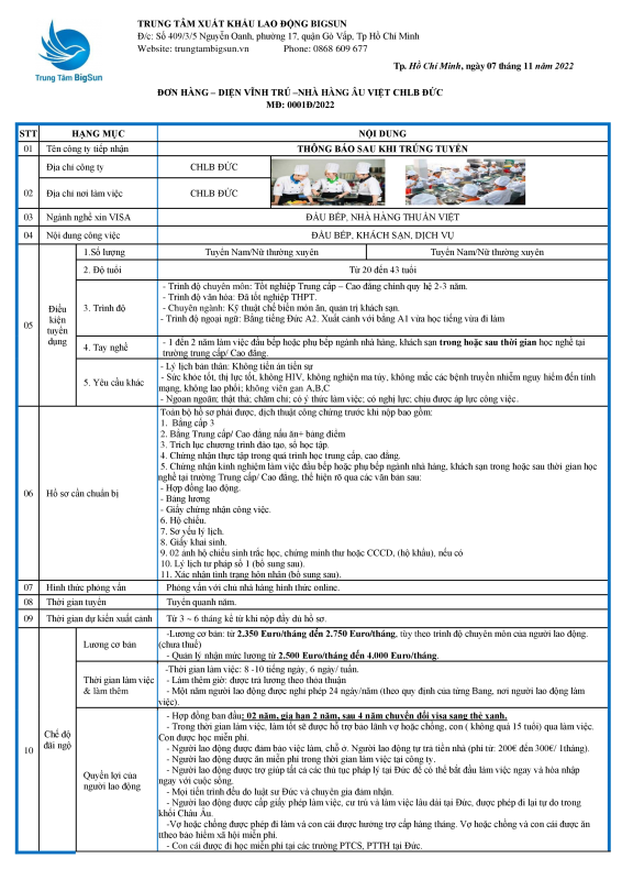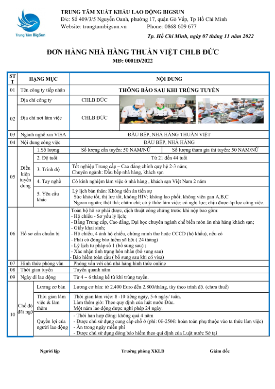 – Thời hạn hợp đồng: 02 năm, gia hạn 2 năm, sau 4 năm chuyển đổi visa sang thẻ xanh (được chủ nhà hàng hỗ trợ)